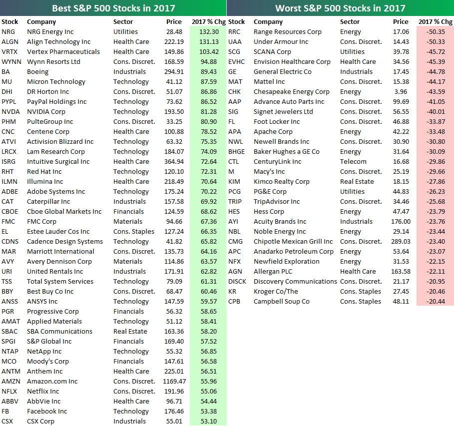 Které akcie z indexu S&P 500 loni přidaly přes 50 %, a které naopak odepsaly minimálně 20 %? (Zdroj: Bespoke Investment Group)