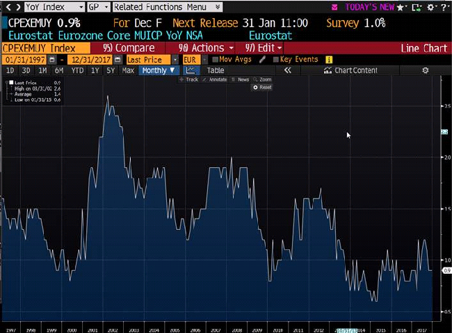 Graf: Eurozóna - Index CPI bez cen potravin, energií, alkoholických nápojů a tabákových výrobků (meziroční růst, v %)