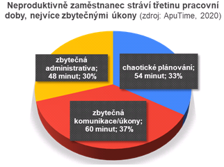 Ztráta vnitřní motivace a ochoty spolupráce se odráží i v produktivitě práce. Podle poslední analýzy společnosti ApuTime zaměstnanci denně promrhají neproduktivní prací 162 minut: zejména zbytečnými úkony či komunikací (37 %), prostoji v důsledku chaotického plánování (33 %) a zbytečnou administrativou (30 %) ve stylu „děláme to, protože to po nás vedení chce“ (viz graf).