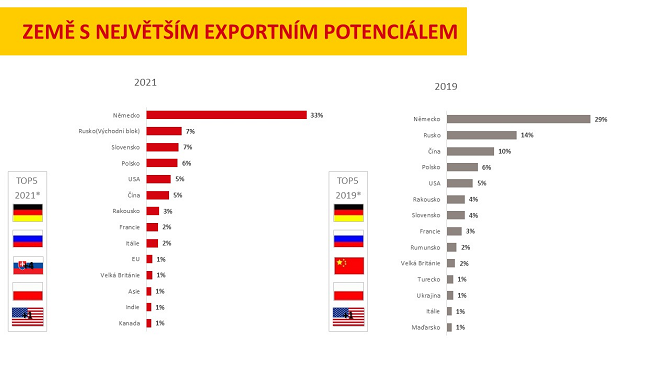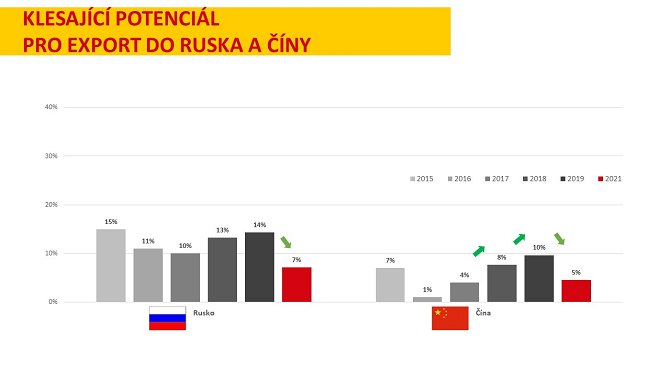 Silná pozice Německa se nezměnila, v žebříčku očekávaných exportních příležitostí si udrželo první místo. Významně rovněž posílila pozice Slovenska, které se dostalo na třetí místo těsně za Rusko. Naopak v letošním roce nastal posun ve vnímání Ruska a Číny mezi českými exportéry. Když vývozci hodnotili očekávané největší exportní příležitosti do budoucna, obě tyto země si oproti roku 2019 v jejich očích pohoršily o polovinu. Například Rusko nyní jmenovalo jako největší exportní příležitost do budoucna sedm procent vývozců. Před dvěma lety to přitom bylo čtrnáct procent. U Číny pak nastal pokles z deseti procent na pět a pád ze třetího na šesté místo.