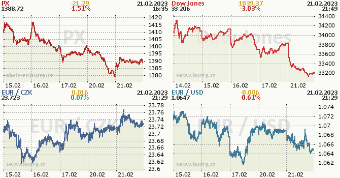 Index Dow, který zahrnuje akcie třiceti předních amerických podniků, ztratil 1,19 % na 34 308,08 bodu. Širší index S&P 500 klesl o 1,69 % na 4 412,53 bodu a index Nasdaq Composite, v němž je zastoupeno mnoho firem z odvětví vyspělých technologií, se snížil o 2,18 % na 13 411,96 bodu. Index volatility VIX se zvedl o 15,17 % na 24,37 bodu a výnos 10letých vládních dluhopisů USA vzrostl o pět a půl bazického bodu na 2,770 %. Ceny ropy klesly zhruba o 3,5 %, zlato půl procenta přidalo a stříbro zdražilo o 1,3 %. Výrazně ztrácely kryptoměny (bitcoin -7,5 %, ether -8,7 %).