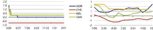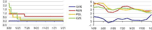 Hospodářský výkon námi sledovaných ekonomik je aktuálně dominantně ovlivňován protiepidemickými opatřeními. V nadcházejícím období bude pandemická i ekonomická situace zásadně formována průběhem vakcinace a obecně schopností jednotlivých zemí zvládat epidemii na svém území. Nejistota ohledně budoucího ekonomického vývoje je tak stále vysoká a významně ztěžuje prognózy centrálních bank. Vlády a centrální banky nadále pokračují v expanzivním působení na ekonomiky s využitím široké palety nástrojů, u centrálních bank dochází k dalšímu rozšiřování prostoru měnové politiky pomocí nekonvenčních opatření. Za uplynulé tři měsíce žádná z námi sledovaných centrálních bank nezměnila své úrokové sazby.