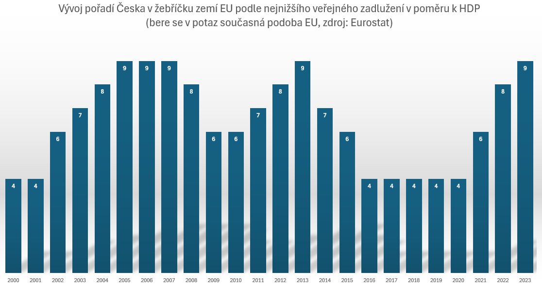 Česko bylo loni 9. nejméně zadluženou zemí EU. Tak špatně na tom předtím bylo naposledy v krizovém roce 2013. Naopak nejlepších výsledků v tomto miléniu dosahovalo v letech 2016 až 2020, kdy bylo soustavně čtvrtou nejméně zadluženou zemí EU (viz graf).