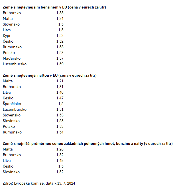 Proč má Česko toto léto jedny z nejlevnějších cen pohonných hmot v EU? Mimořádně jsou levnější než v Polsku nebo Rumunsku (viz tabulka s daty Evropské komise níže).