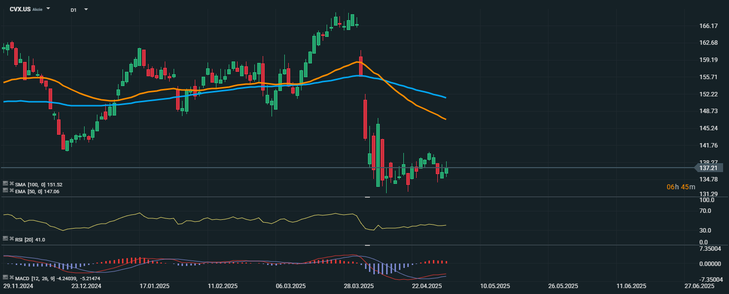 V posledních dvou týdnech se akcie pohybují v bočním pásmu mezi 131 a 139 USD, přičemž zatím nedošlo k průlomu, který by naznačil změnu směru. Pokud by cena prorazila nad rezistenci kolem 139 USD, mohlo by dojít k návratu k úrovním 145 až 147 USD, kde se nachází klouzavé průměry. V opačném případě by prolomení podpory kolem 131 USD mohlo otevřít cestu k dalším poklesům, zejména v kontextu klesajících cen ropy a oznámení o snížení zpětných odkupů akcií.