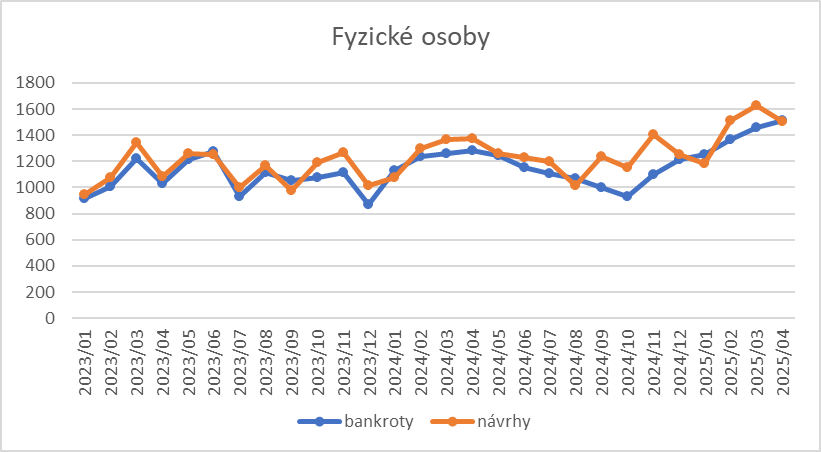 Graf 1: Počet osobních bankrotů a návrhů na ně od ledna 2023 do dubna 2025