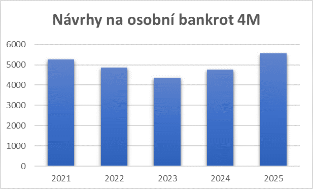 Za posledních 12 měsíců, tedy od loňského května do konce dubna, bylo vyhlášeno celkem 14 415 osobních bankrotů, což je o 855 (o 6 %) více než v předchozím období. Zároveň bylo podáno 15 570 návrhů na osobní bankrot, oproti předchozím 12 měsícům o 1 330 (o 9 %) více. „Ještě výraznější růst zaznamenaly osobní bankroty, zejména návrhy na osobní bankrot, za čtyři měsíce letošního roku ve srovnání se stejným obdobím loňského roku. V yšší počet návrhů na osobní bankrot než v letošních čtyřech měsících byl podán naposledy v roce 2020. Z toho lze odvodit, že počet osobních bankrotů poroste i v následujícím období,“ doplňuje Věra Kameníčková.