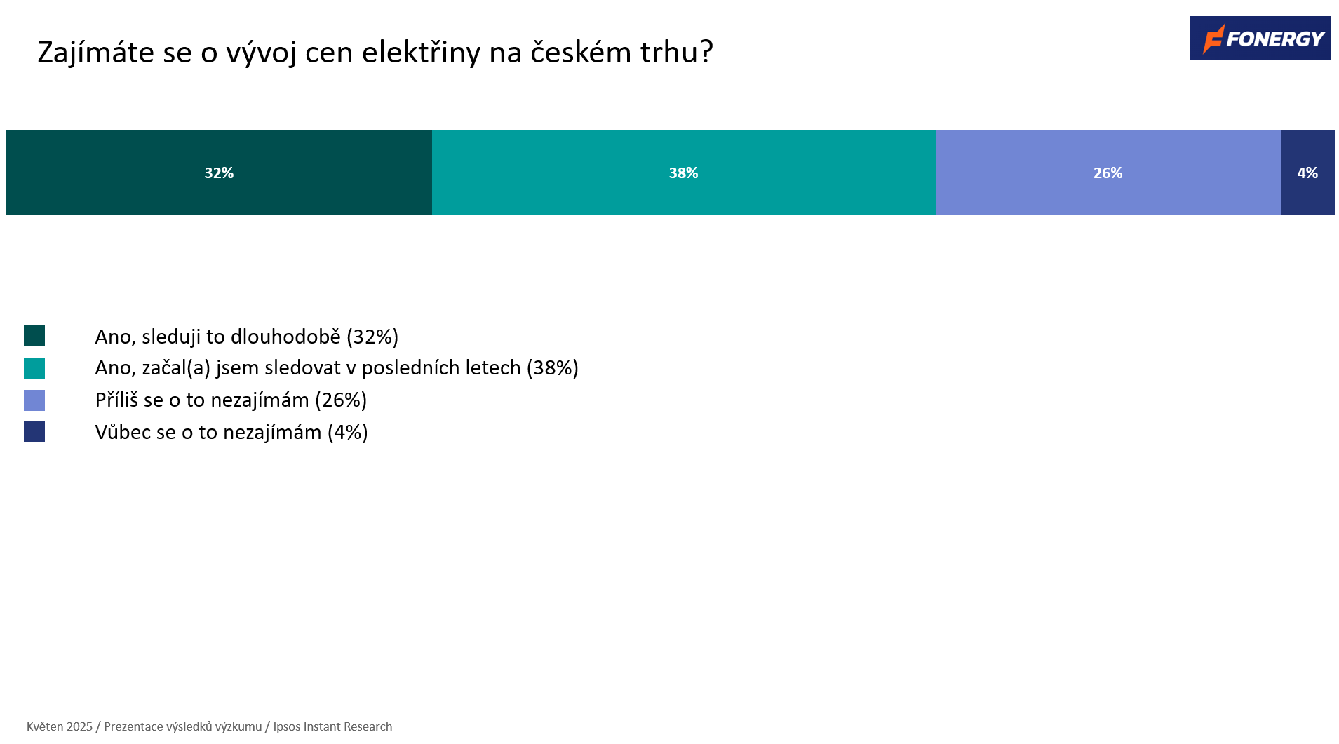 Sedm z deseti domácností dnes aktivně sleduje ceny energií a více než polovina přesně ví, kolik za elektřinu měsíčně platí. Vyplývá to z aktuálního výzkumu společnosti Fonergy, který potvrzuje výraznou a pokračující proměnu chování spotřebitelů po energetické krizi. Češi se na trhu orientují lépe než dříve a jsou otevřenější změnám. Průzkum také potvrdil, že ceny na trhu nadále klesají. V posledním roce elektřina zlevnila 45 % dotazovaných domácností a 38 % zůstala stejná. Výrazné zdražení bylo zaznamenáno pouze u 4 % respondentů.