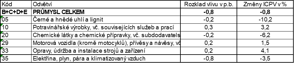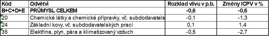 Nižší byly ceny koksu a rafinovaných ropných výrobků. Klesly ceny elektřiny, plynu, páry a klimatizovaného vzduchu o 3,5 %, chemických látek a přípravků o 6,2 % a černého a hnědého uhlí a lignitu o 10,2 %.
