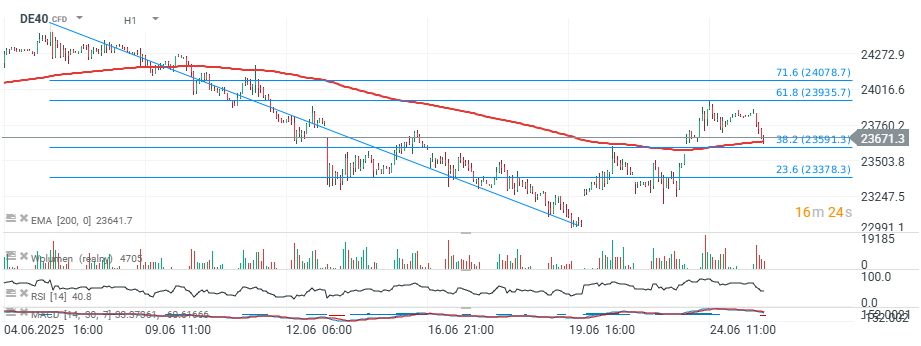 Futures na DAX (DE40) aktuálně klesají o více než 0,7 % a testují 200periodický exponenciální klouzavý průměr (EMA) na hodinovém grafu. Prodejní objemy dnes výrazně převažují.