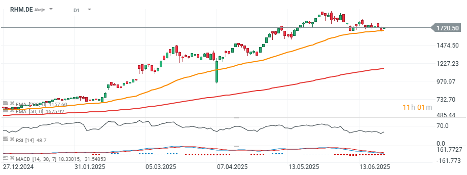 Akcie německého obranného giganta Rheinmetall dnes rostou o více než 2 %, přičemž se vyšplhaly nad 1 720 EUR a zotavily se nad 50denní exponenciální klouzavý průměr (EMA50) na denním grafu. Aktuálně se akcie obchodují přibližně 8 % pod svým historickým maximem.
