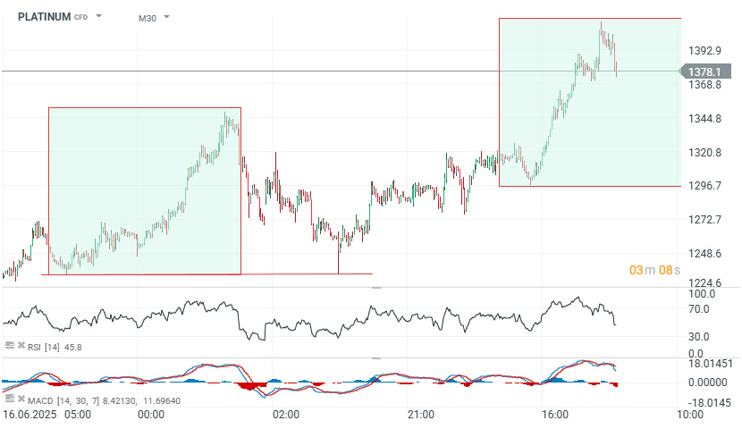 Cena platiny klesla z 1 415 USD na 1 374 USD, přičemž kov se aktuálně pokouší o odraz. Při pohledu na graf a současné cenové momentum však zůstává ve hře scénář 1:1 korekce – obdobný pohyb byl pozorován mezi 16. a 19. červnem. Klíčová supportní zóna se nachází mezi 1 300 a 1 304 USD za unci. Důležitá rezistenční oblast je vymezena poblíž hladiny 1 390–1 400 USD.