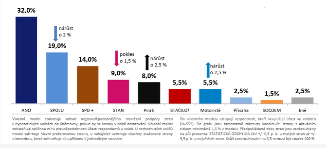 Nejvyšší voličské preference má ANO (32 %). Následuje koalice SPOLU (19 %), SPD s podporou dalších stran (14 %), STAN (9 %), Piráti (8 %), Stačilo! (5,5 %) a Motoristé (5,5 %).