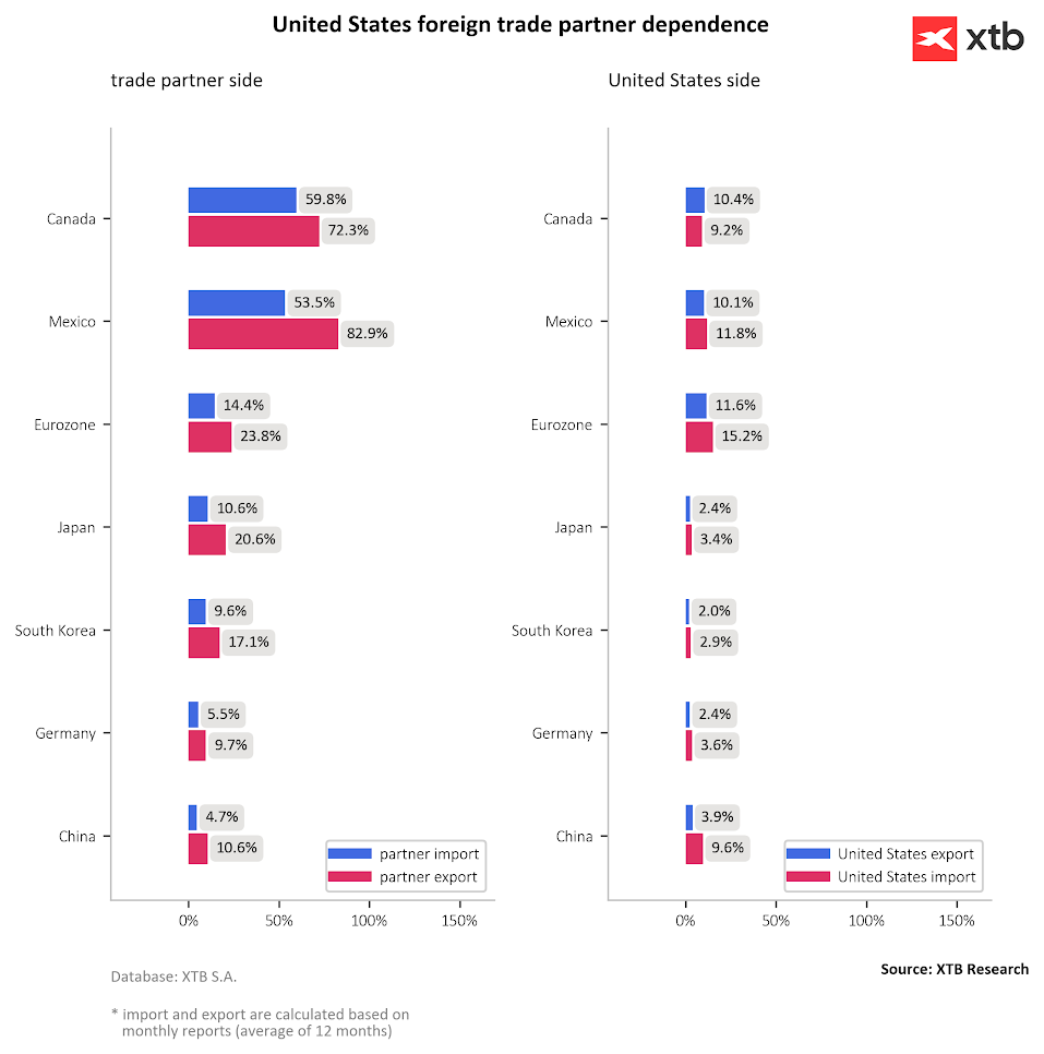 Graf ukazuje význam mezinárodního obchodu s partnery a USA. Eurozóna má největší podíl na dovozu do USA, jen o málo menší než celá EU, která navíc zahrnuje země jako Polsko, Česká republika a Skandinávie. Zdroj: Bloomberg Finance LP, XTB