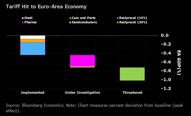 Ekonomické analýzy ukazují, že dopad na HDP EU bude významný, ale omezený. Podle odhadů Bloomberg Economics současná 10% cla snižují HDP eurozóny přibližně o 0,3 %, přičemž zavedení 30% cel by mohlo tento dopad zdvojnásobit. Ekonomové Goldman Sachs odhadují, že pokud by byla 30% cla zachována po delší dobu, mohl by HDP eurozóny do konce roku 2026 kumulativně klesnout až o 1,2 %.