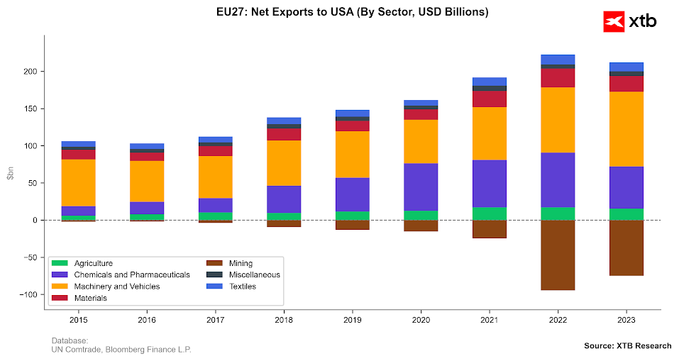Čistý export z EU do USA v posledních letech. Jak je patrné, největší podíl tvoří stroje a vozidla, následované chemií a farmaceutikem. EU je naopak čistým dovozcem surovin z USA. Zdroj: Bloomberg Finance LP, XTB