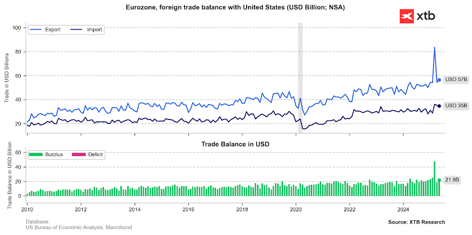 Ještě předtím, než začala platit vzájemná cla, bylo patrné zřetelné zvýšení dovozu z EU do USA. Nyní se nabízí otázka, zda se dočkáme další vlny poptávky po evropských produktech před 1. srpnem. Zdroj: Bloomberg Finance LP, XTB