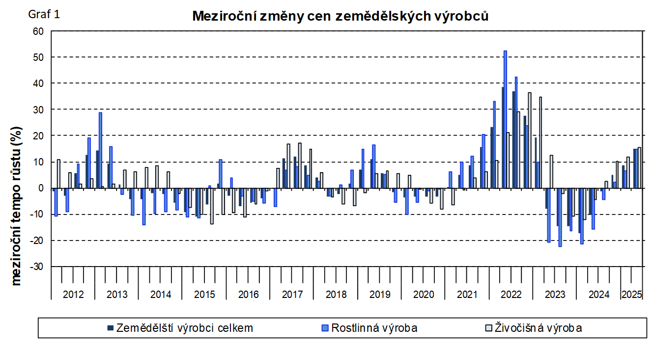 Ceny zemědělských výrobců se ve 2. čtvrtletí 2025 oproti 1. čtvrtletí 2025 zvýšily o 3,9 %. Ceny skotu vzrostly o 13,0 %, vajec o 7,9 %, prasat o 4,5 %, drůbeže o 3,6 % a obilovin o 2,1 %. Ceny olejnin a mléka vzrostly shodně o 2,8 %. Ceny zemědělských výrobců byly ve 2. čtvrtletí 2025 meziročně vyšší o 14,9 %. Ceny v rostlinné výrobě vzrostly o 14,7 % v důsledku vyšších cen ovoce o 28,3 %, olejnin o 24,3 %, obilovin o 14,9 % a čerstvé zeleniny o 6,9 %. Ceny brambor klesly o 23,8 %. Ceny v živočišné výrobě se zvýšily o 15,6 %, vzrostly ceny vajec o 41,8 %, skotu o 28,0 %, mléka o 19,7 % a drůbeže o 6,0 %. Klesly ceny prasat, a to o 9,8 %.