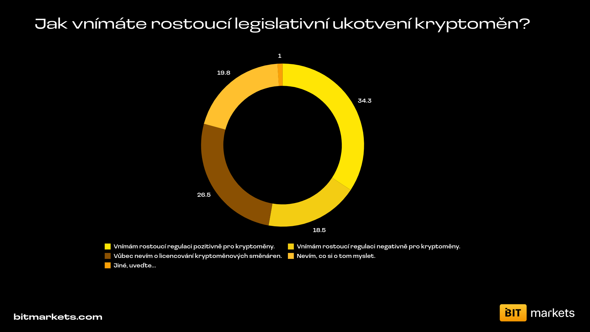 V případě rostoucí regulace kryptoměnového trhu ze strany úřadů, například licencování krypto směnáren, pozitivní naladění u veřejnosti převažuje výrazněji. Regulace vítá 34 % respondentů, kteří se zajímají o krypto, zatímco 19 % větší zásahy regulátorů vnímá negativně.