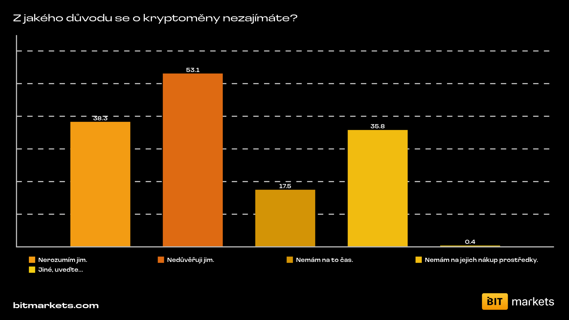 Průzkum u části populace, která se naopak o kryptoměny nezajímá, zjišťoval také její důvody. Nedůvěra v kryptoměny (51 %) dominuje. Následuje nedostatek znalostí (38 %) a nedostatek prostředků (36 %).