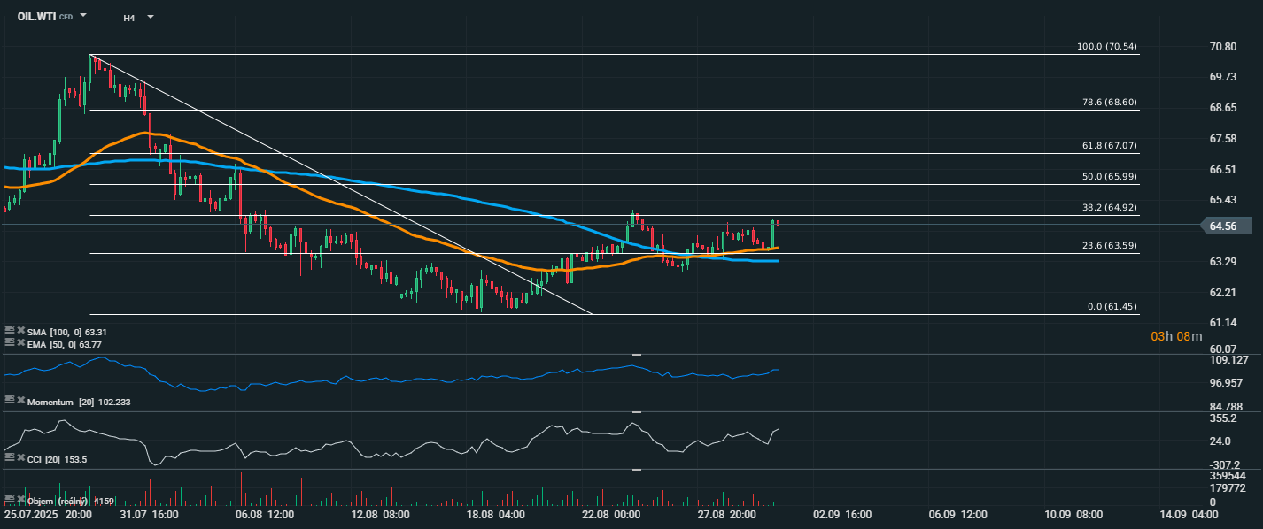 Cena OIL.WTI se obchoduje kolem úrovně 64,56 USD, čímž testuje klíčovou Fibonacciho hladinu 38,2 % (64,92 USD). Po předchozím sestupném trendu došlo k průrazu klesající trendové linie a cena se nyní konsoliduje v úzkém rozpětí nad klouzavými průměry EMA 50 (63,77 USD) a SMA 100 (63,31 USD), což signalizuje potenciální obrat trendu. Momentum dosahuje hodnoty 102,2, což podporuje růstový výhled. CCI vystoupalo na 153,5, tedy do zóny překoupenosti, což může signalizovat možnou krátkodobou korekci, ale v rámci silného nákupního tlaku.