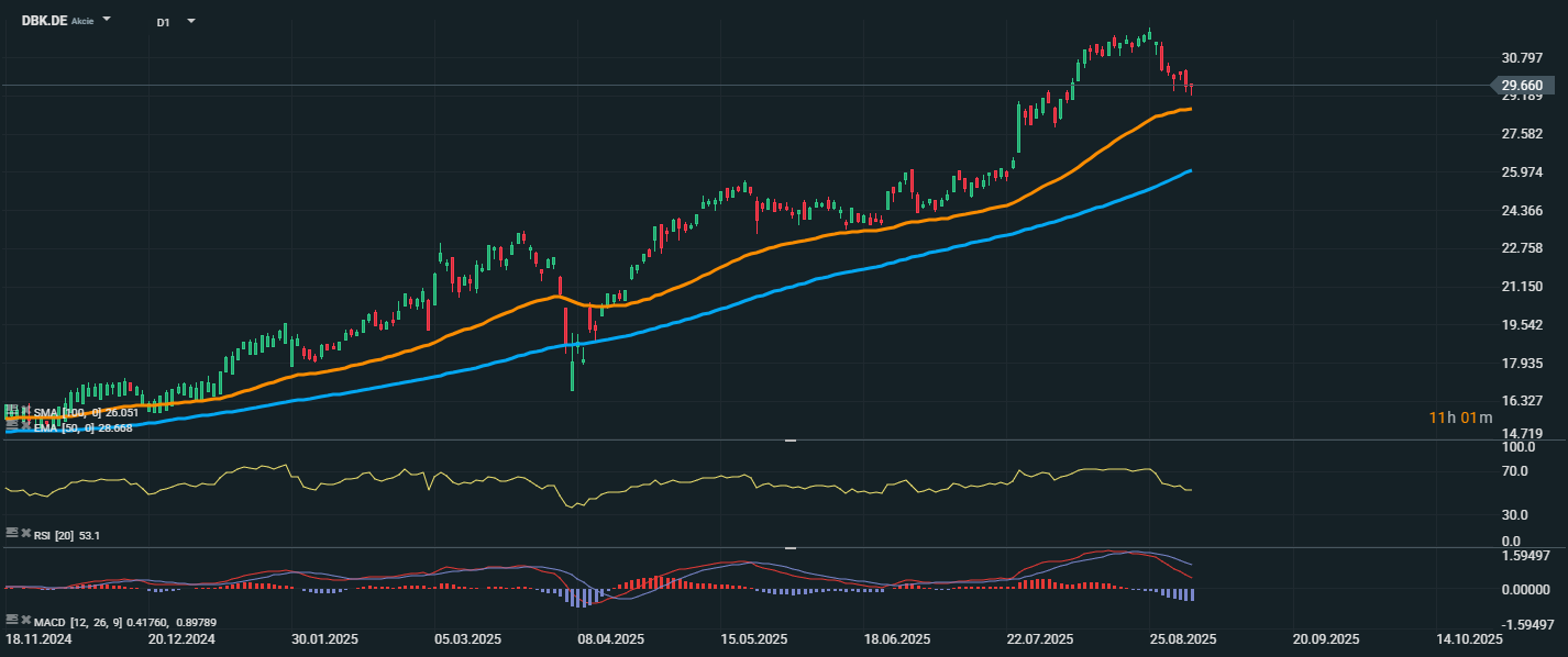 Akcie Deutsche Bank po dlouhém růstovém období aktuálně procházejí mírnou korekcí a obchodují se na úrovni 29,66 EUR. Cena zůstává stále nad klouzavými průměry EMA 50 (28,66 EUR) a SMA 100 (26,05 EUR), což potvrzuje, že dlouhodobý trend zůstává býčí. Korekce zatím působí jako technické vydechnutí po silném růstu, a pokud se cena udrží nad EMA 50, mohlo by jít o zdravou konsolidaci před dalším růstem.