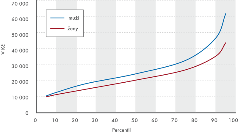 Mzdová oblast žen je navíc sevřenější, rozdíly nižší, takže zatímco mezi zaměstnanci s nejnižšími výdělky jsou rozdíly podle pohlaví malé (čtyři procenta na pátém percentilu), u skupiny nejlépe odměňovaných je propast mezi platy mužů a žen již více než čtvrtinová (29 % na 95. percentilu). Nerovnost prudce roste směrem k nejvyšší mzdové oblasti. Mzdy nad 100 tis. Kč hrubého vloni pobíralo 1,6 % mužů a jen 0,4 % žen. Právě malá, odtržená skupina top manažerů – mužů s velmi vysokými výdělky pak způsobuje, že z pohledu průměrných mezd jsou rozdíly podle pohlaví ve mzdách české populace jedny z nejvyšších v Evropě.
