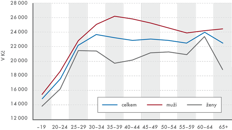 Pokud se však na vývoj mezd podíváme genderovou optikou, zjistíme zajímavé rozdíly. Na nejvyšší mzdy muži dosahují až ve věku 35–39 let (26 189 Kč). V pozdějším věku jejich mzdy klesají jen k úrovni okolo 23 tis. Kč. U žen má však úroveň mezd klesající tendenci, z 21 449 (věk 25–29 let a starší kategorie) se propadá na 19 719 Kč (věk 35–39). K předchozím hodnotám svých mezd se pak ženy pracně dostávají až po 45. roce života. Po pětapadesátce už ale zase pomalu odcházejí do pracovní neaktivity, neboť trh práce opouštějí stále ještě dříve než muži.