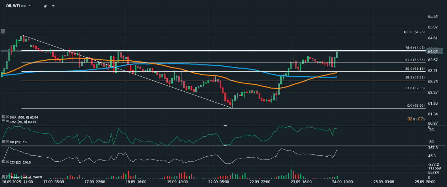 Cena ropy WTI pokračuje v růstu a aktuálně se obchoduje na úrovni 64,04 USD, těsně pod úrovní 78,6 % Fibonacciho retracementu (64,08 USD). Trh tak téměř kompletně vymazal předchozí pokles od vrcholu 64,76 USD, což značí silný návrat kupců do trhu. Technická situace je výrazně býčí. Cena prorazila nad klouzavé průměry EMA 50 (63,14 USD) a SMA 100 (62,94 USD), které nyní fungují jako krátkodobá podpora. Oba průměry navíc začínají měnit směr směrem vzhůru, což signalizuje otočení trendu. CCI dosahuje hodnoty 240, což značí extrémní překoupenost, stejně jako %R na -15, který se nachází velmi blízko překoupené zóny. To může v krátkém horizontu vést k krátkodobému zpomalení nebo mírné korekci, avšak v rámci silného růstového impulsu. Objemy obchodů rovněž rostou, což potvrzuje důvěru v aktuální průraz.