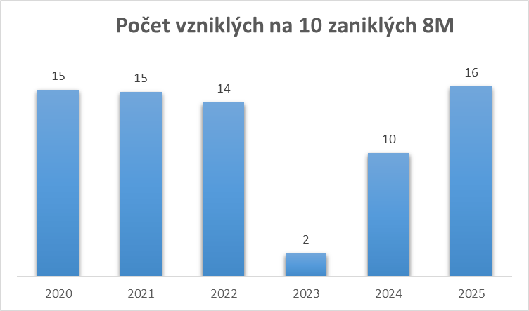 Graf 2: Počet vzniklých fyzických osob podnikatelů na 10 zaniklých za 8 měsíců roku