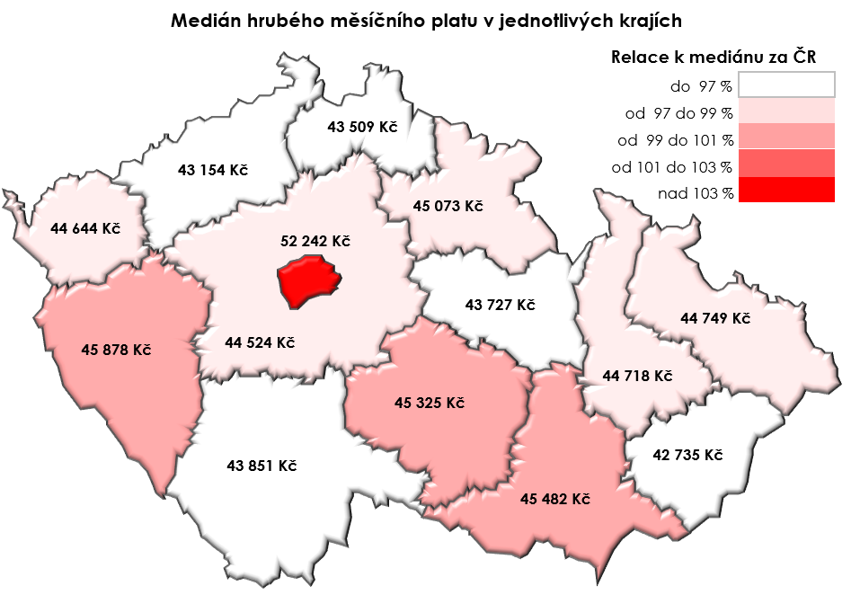Medián hrubého měsíčního platu dosáhl v 1. pololetí 2025 výše 45 728 Kč, meziročně vzrostl o 6,0 %. Průměrný hrubý měsíční plat dosáhl úrovně 49 721 Kč, a zvýšil se tak o 5,9 %. Rozdíl mezi průměrným hrubým měsíčním platem a mediánem hrubého měsíčního platu v 1. pololetí 2025 činil 3 993 Kč.