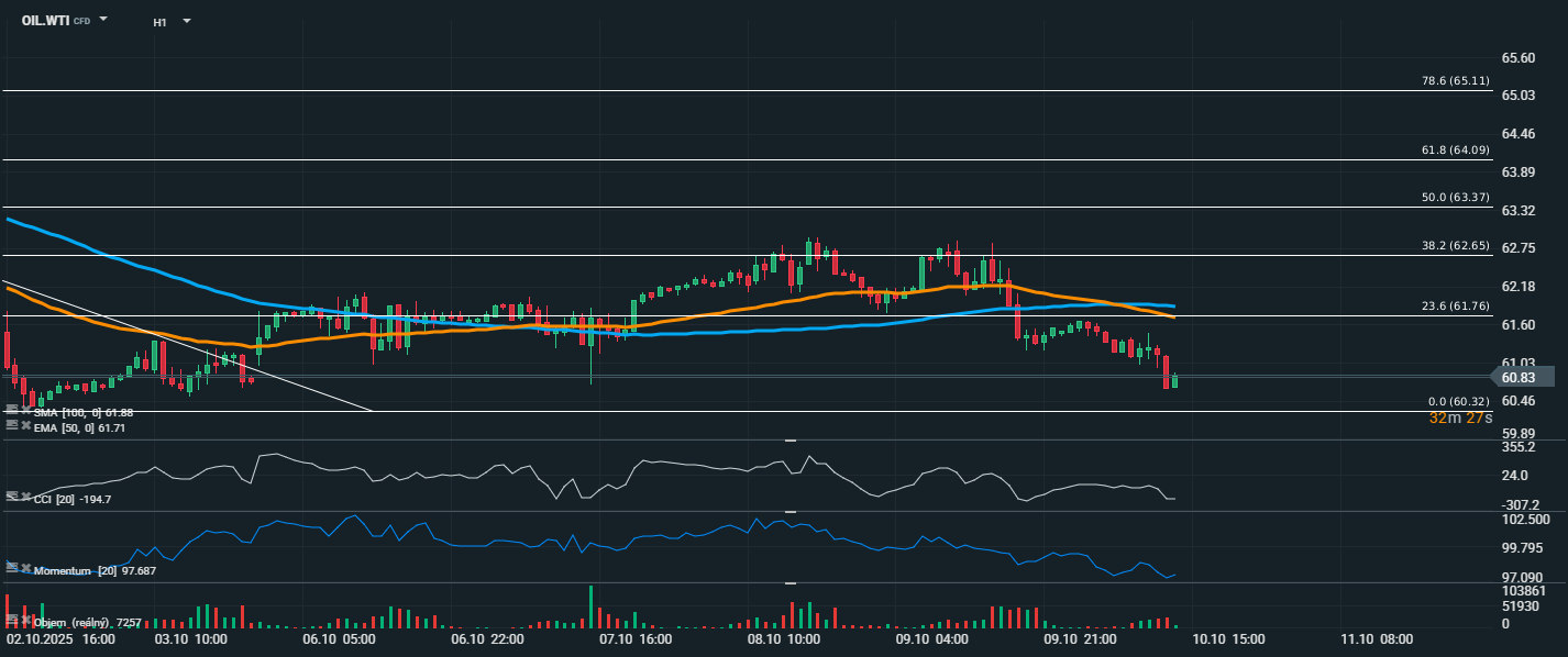 Cena OIL.WTI se aktuálně obchoduje kolem 60,83 USD za barel, přičemž se blíží k ceně 60,32 USD, která v minulosti sloužila jako support . Technický obrázek je nyní jednoznačně medvědí. Cena klesla pod klouzavé průměry EMA 50 (61,71 USD) i SMA 100 (61,88 USD), což naznačuje zhoršený sentiment a převahu prodejců. Tento průraz potvrzuje pokračující sestupný trend, který trvá již několik obchodních seancí. CCI se nachází na výrazně nízké hodnotě –194,7, což značí silnou přeprodanost trhu. To sice může naznačovat krátkodobý prostor pro technický odraz, nicméně aktuální momentum nadále ukazuje na pokles. Momentum osciluje poblíž hodnoty 97,6, což odpovídá oslabenému růstovému tempu.