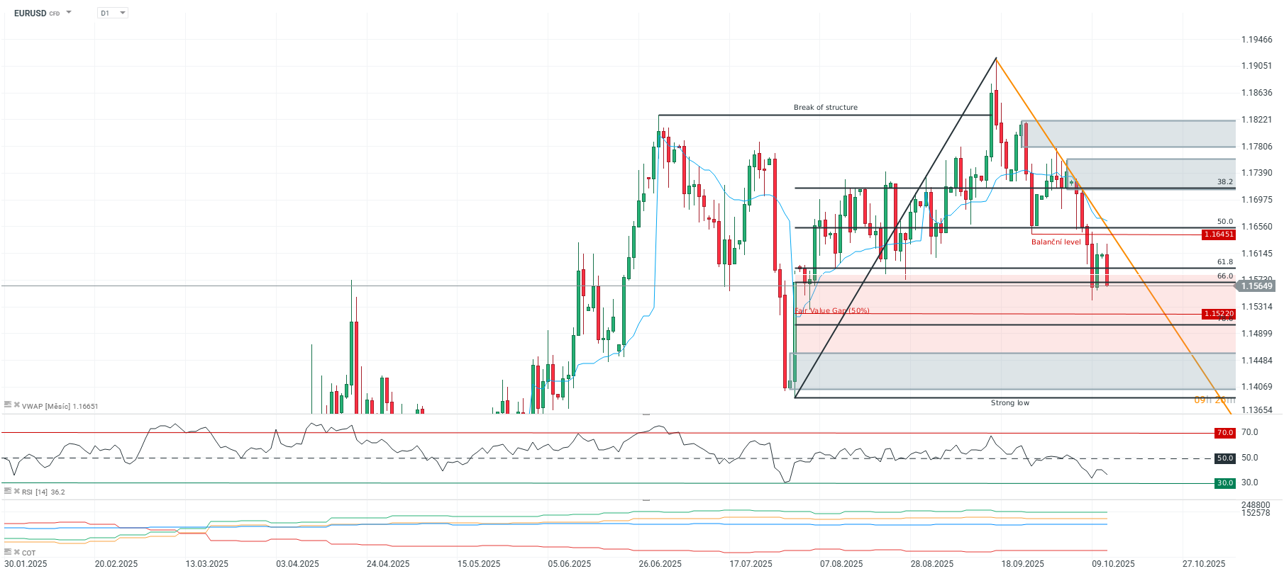 Klíčová rezistenční zóna leží na 1,1645–1,1665, kde se střetává balanční level s měsíčním VWAPem. K nim se ještě přidává klesající trendová linie. Jedná se tedy o velmi zajímavou oblast, která pravděpodobně přiláká prodejce, pokud se cena dostane výše. Nicméně, dokud neprorazíme klíčové oblasti jako je tato a trh se bude držet stále pod ní, zůstává hlavní scénář bearish.