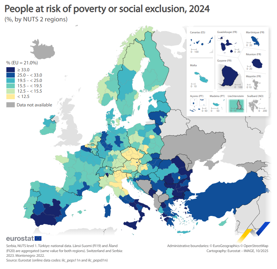 In 2024, there were 25 NUTS 2 regions where at least 33% of the population was at risk of poverty or social exclusion (darkest shade of blue in the map). These regions were concentrated in Greece (5 regions), Bulgaria, Spain, Italy (4 regions each), as well as Romania and the outermost regions of France (3 regions each). This group also included 2 predominantly urban regions in western EU countries – the capital region of Belgium (Région de Bruxelles-Capitale / Brussels Hoofdstedelijk Gewest) and Bremen in Germany.