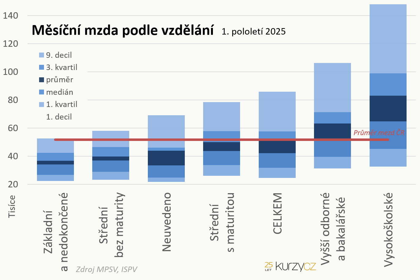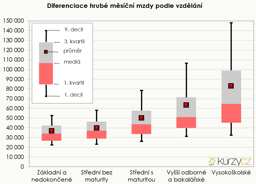 | Vzdělání | 1. decil | 1. kvartil | medián | průměr | 3. kvartil | 9. decil |