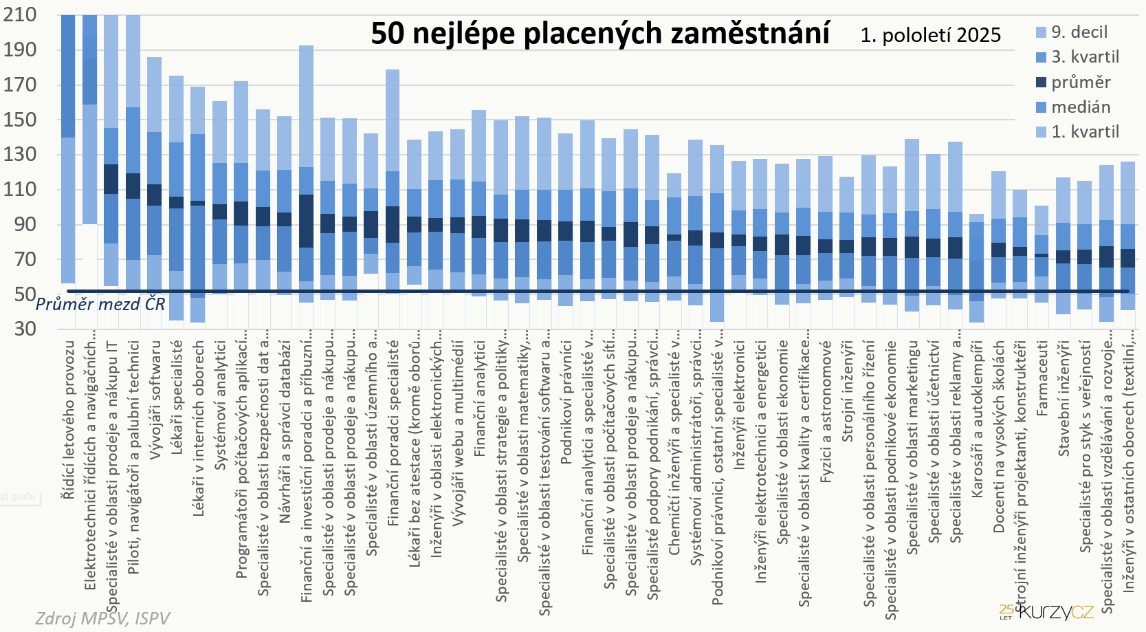 Nejvyšší příjmy v komerční sféře měli v 1. pololetí roku 2025 řídící letového provozu. Medián jejich hrubých mezd byl 288 609 Kč měsíčně, průměr pak byl nižší, 267 135 Kč. Jde o nepočetnou skupinu zhruba 500 zaměstnanců. Následovali je Elektrotechnici řídících a navigačních zařízení letového provozu s průměrem 184 864 Kč a Specialisté v oblasti prodeje a nákupu IT s průměrnou mzdou ve výši 124 629 Kč.