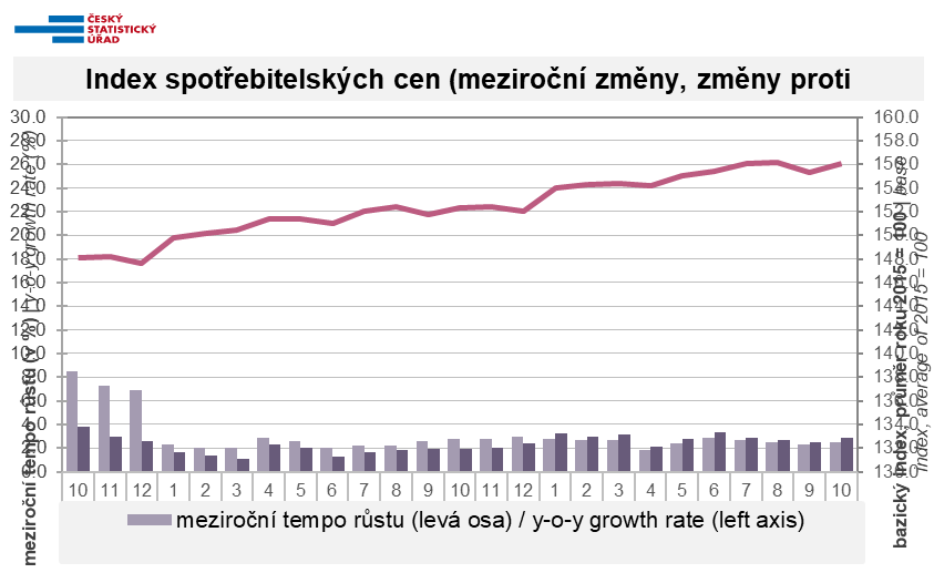 Míra inflace vyjádřená přírůstkem průměrného indexu spotřebitelských cen za posledních 12 měsíců proti průměru předchozích 12 měsíců byla v říjnu 2,6 % (v září také 2,6 %).