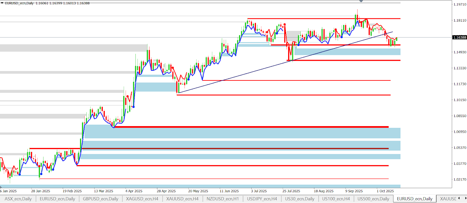 Měnový pár EUR/USD po proražení rostoucí trendové linie zamířil ke klíčovému supportu na 1,1560, který byl v předchozích analýzách často zmiňován. Tato hladina může být příležitostí pro swingové obchodníky, kteří spekulují na návrat k růstu.