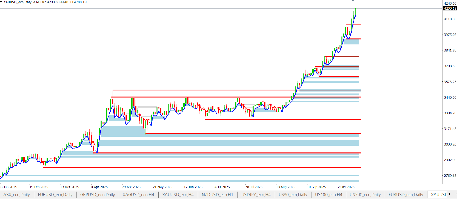 Zlato pokračuje ve výrazném růstu, podporováno kombinací geopolitických rizik, slabšího dolaru a obav z možného snížení sazeb. Ceny se pohybují v blízkosti historických maxim a trend zůstává silně býčí.