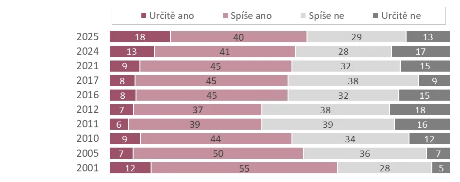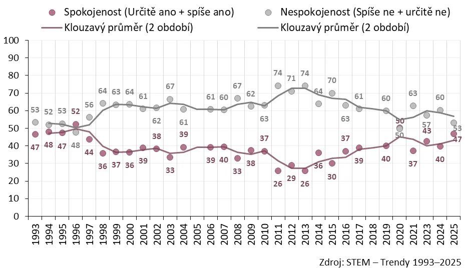 Z perspektivy časové řady STEM od 90. let je patrné, že převažující nespokojenost s fungováním demokracie je dlouhodobým jevem. Výrazně vyšší byla například v době Nečasovy vlády. U těch, kteří jsou nespokojení s fungováním demokracie, bychom to neměli automaticky číst jako volání „po starých časech“, rozumějme nedemokratických, ale jde spíš o znechucení z toho, co se u nás děje. Není v tom až tak nostalgie, jako spíš aktuální vztek, frustrace a nejistota.