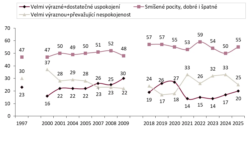 V osobním hodnocení polistopadového vývoje v České republice je nejčastějším postojem směs pocitů, dobrých i špatných. K této charakterizaci se přiklání více než polovina obyvatel ČR. Pětina (20 %) českých občanů pociťuje výrazné nebo dostatečné uspokojení z vývoje po roce 1989, čtvrtina (25 %) je naopak výrazně nebo převážně nespokojena. V porovnání s předchozím rokem sledujeme pokles podílu nespokojených (z 33 % na 25 %). Z dlouhodobé perspektivy časové řady od roku 1997 je ale patrné, že podíl těch, kdo jsou s polistopadovým vývojem výslovně spokojeni, je v posledních letech stabilně nižší než zhruba čtvrtinový, což bylo obvyklé dříve.