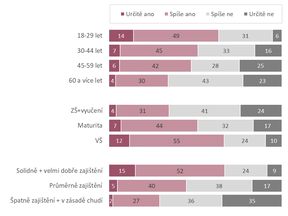 V otázce občanských svobod se nyní třípětinová většina občanů (58 %) domnívá, že občanské svobody jsou u nás dostatečně zajištěny. Podobně jakou u spokojenosti s fungováním demokracie je patrné mírné zvýšení podílu pozitivních hodnocení (o 4 procentní body). A rovněž také sledujeme zásadní rozdíly podle politických preferencí. Mezi voliči koalice SPOLU (92 %), STAN (90 %) a Pirátů (90 %) zcela jednoznačně převažuje názor, že občanské svobody jsou u nás dostatečně zajištěny. Naopak voliči SPD (29 %) se většinově přiklání k opačnému postoji. Voliči hnutí ANO a Motoristů jsou rozděleni, polovina je s mírou občanských svobod spokojena, polovina nikoliv.