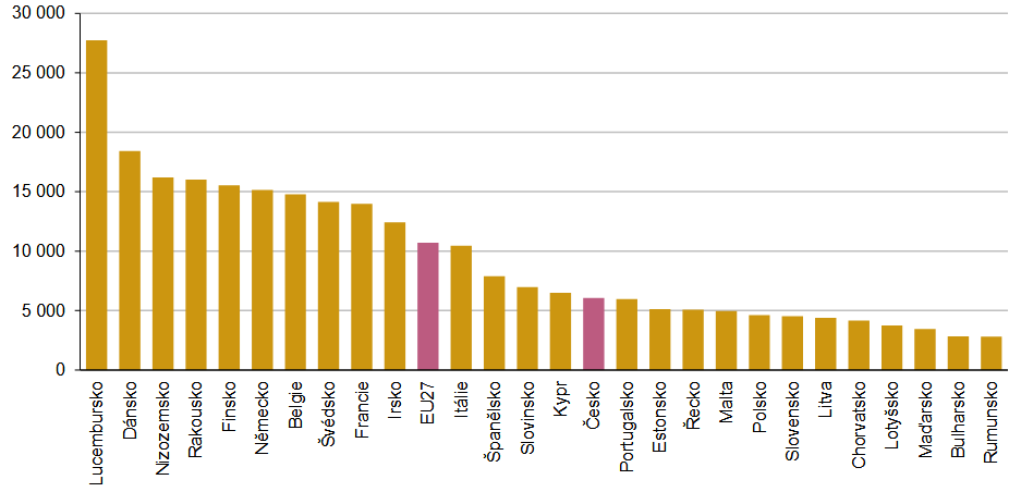 Přibližně 6 000 euro na jednoho obyvatele vydalo v roce 2023 Česko na sociální ochranu. Tato částka dosahovala 57 % průměrných výdajů v Evropské unii (EU 27). Podobný objem výdajů v přepočtu na jednoho obyvatele jako v Česku, byl na sociální ochranu vynakládán v Portugalsku a na Kypru. O polovinu více než průměrné výdaje EU 27 vydalo v roce 2023 Rakousko a Nizozemsko. Výdaje na sociální ochranu Dánska dosáhly na 170 % evropského průměru a výdaje Lucemburska na více než dvojnásobek. Naopak méně než třetinu průměrných výdajů v EU 27 vynaložilo na sociální ochranu v témže roce v přepočtu na jednoho obyvatele Bulharsko, Rumunsko a Maďarsko.