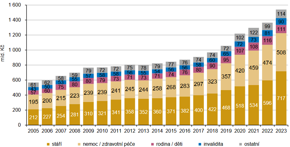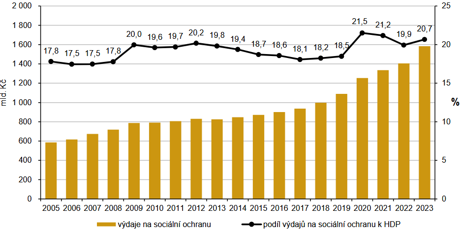 Vývoj výdajů na sociální ochranu v Česku má dlouhodobě rostoucí tendenci. V roce 2023 dosáhly tyto výdaje hodnoty 1 583,7 mld. Kč (včetně administrativních nákladů), což byl oproti předchozímu roku nárůst o 178 mld. Kč. Jejich podíl na hrubém domácím produktu [1] (HDP) od roku 2012, kdy dosáhl 20,2 %, klesal až do roku 2017 a dále opět mírně rostl. V roce 2020 vzhledem k výraznému nárůstu výdajů na sociální ochranu a poklesu HDP v souvislosti s pandemií Covid-19 dosahovaly výdaje na sociální ochranu podle systému ESSPROS 21,5 % HDP. Od roku 2021 tento podílový ukazatel opět klesal až na hodnotu 19,9 % v roce 2022. V roce 2023 došlo opět k nárůstu, kdy výdaje na sociální ochranu v Česku představovaly 20,7 % HDP.