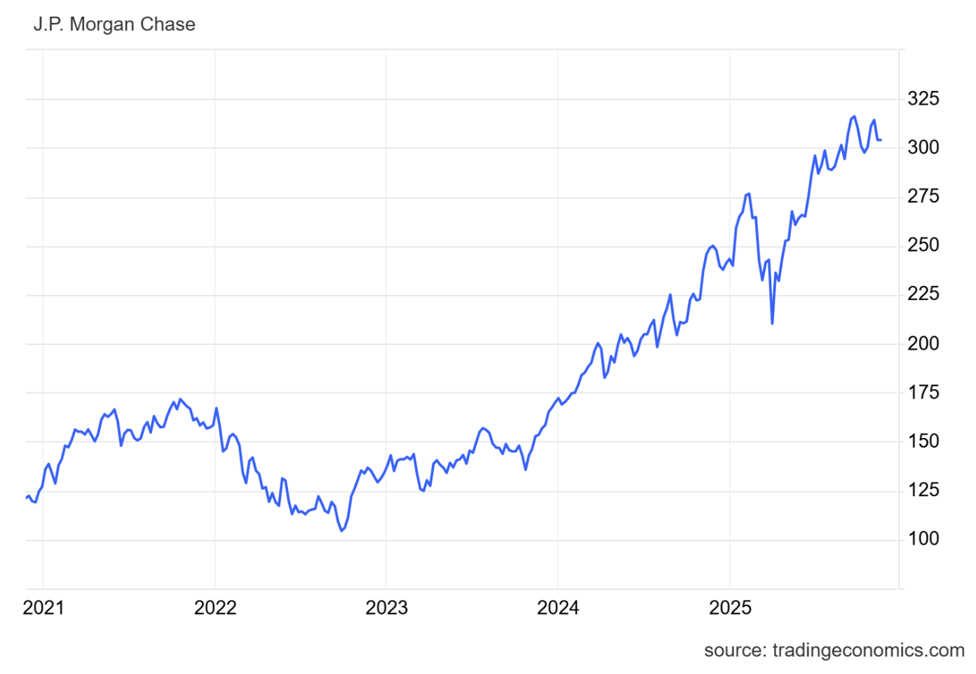 Výkonnost ceny akcií společnosti JPMorgan Chase za posledních pět let* Zdroj: TradingEconomics