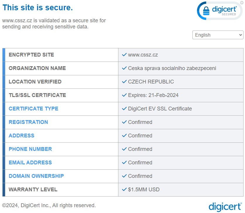 Oficiální webové stránky ČSSZ jsou www.cssz.cz a eportal.cssz.cz a jejich pravost poznáte podle digitální pečeti společnosti DigiCert umístěné na stránce vpravo dole. Po kliknutí na symbol/obrázek pečeti se zobrazí identifikační údaje ČSSZ – tak si snadno ověříte, že jste na oficiálním webu.