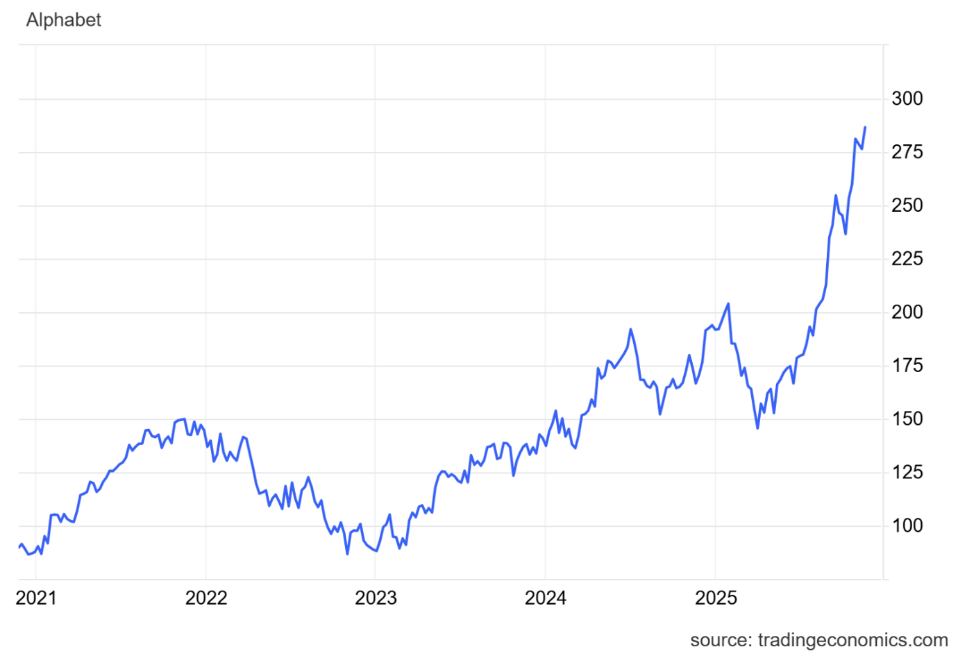 Výkonnost ceny akcií společnosti Alphabet za posledních pět let. Zdroj: TradingEconomics