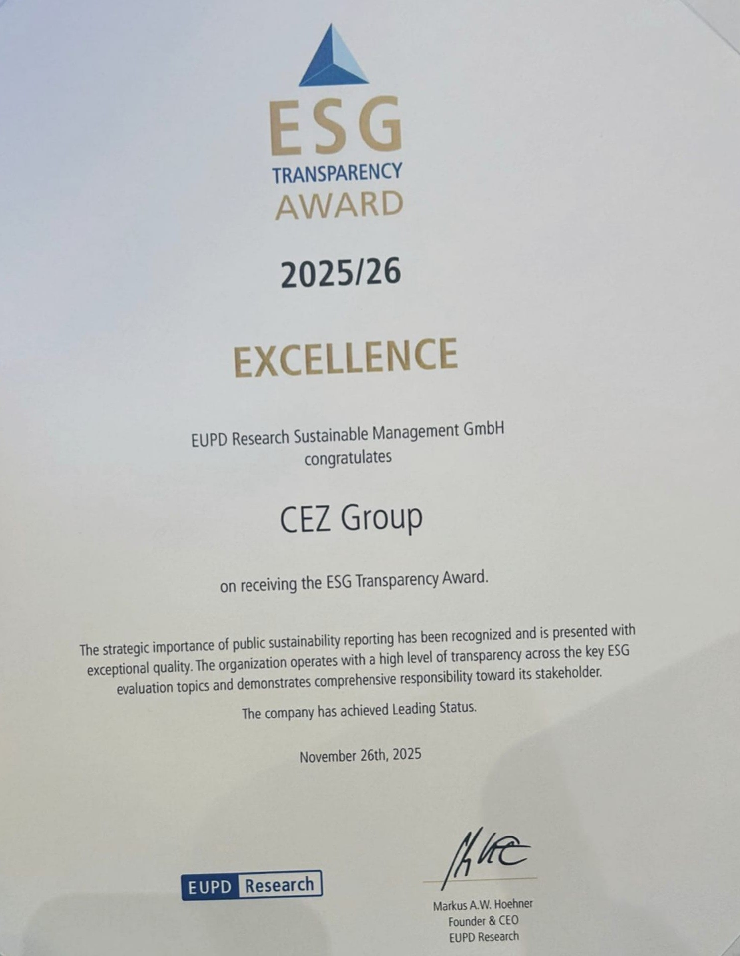 Skupina ČEZ získala cenu ESG Transparency Award 2025 udělovanou mezinárodní organizací pro výzkum trhu EUPD Research, která poskytuje certifikační a poradenské služby v oblasti udržitelnosti. Ocenění je udělováno za rozsah, transparentnost a otevřenost reportingu nefinančních ukazatelů.