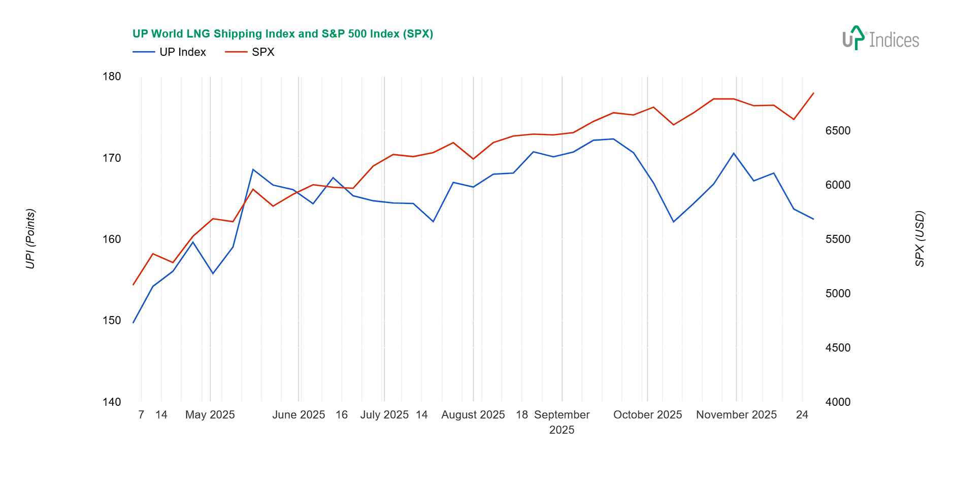 Týden 48-2025: Graf indexu UP World LNG Shipping Index s indexem S&P 500 (Zdroj: UP-Indices)