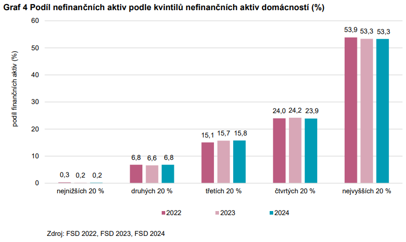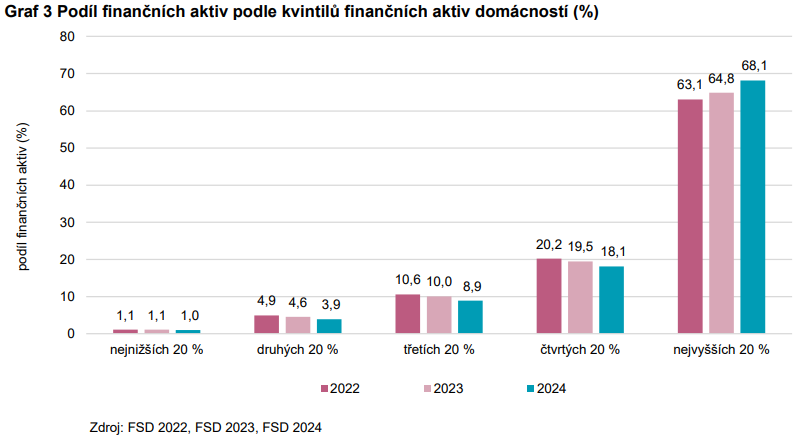 Rozdělení majetku ve společnosti je krajně nerovnoměrné, což se týká finančních i nefinančních aktiv. V roce 2024 vlastnila pětina nejbohatších domácností 68,1 % všech finančních aktiv, zatímco pětina nejchudších vlastnila pouze 1,0 % (viz Graf 3). Nejvyšší rozdíly podle finančních aktiv domácností jsou mezi 4. a 5. nejbohatším kvintilem, v roce 2024 činil rozdíl rovných 50,0 p. b.